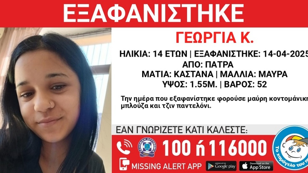 Συναγερμός έχει σημάνει από τη Μεγάλη Δευτέρα στην περιοχή της Πάτρας για την εξαφάνιση μιας 14χρονης. Το «Χαμόγελο του Παιδιού» ενημερώθηκε σήμερα...