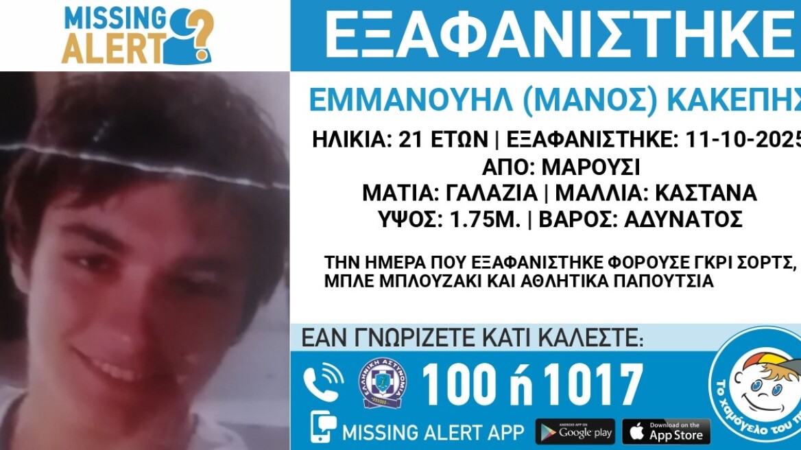 Στις 11/10/2025, εξαφανίστηκε από την περιοχή του Αμαρουσίου , ο Εμμανουήλ (Μάνος) Κακέπης, 21 ετών. «Το Χαμόγελο του Παιδιού» ενημερώθηκε σήμερα, 13/10/2025,...