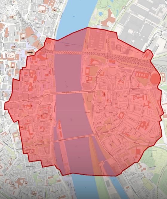 O χάρτης με τη περιοχή της Κολωνίας που εκκενώνεται για την εξουδετέρωση των τριών βομβών:
