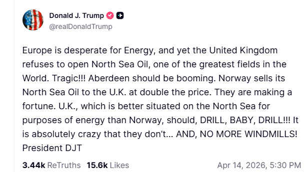 «Η Ευρώπη έχει απεγνωσμένα ανάγκη για ενέργεια, και, όμως, το Ηνωμένο Βασίλειο αρνείται να αξιοποιήσει το πετρέλαιο της Βόρειας Θάλασσας, ένα από τα μεγαλύτερα κοιτάσματα στον κόσμο. Τραγικό!!!», έγραψε σήμερα (14/4) στην πλατφόρμα Truth Social ο πρόεδρος των ΗΠΑ, Ντόναλντ Τραμπ.
