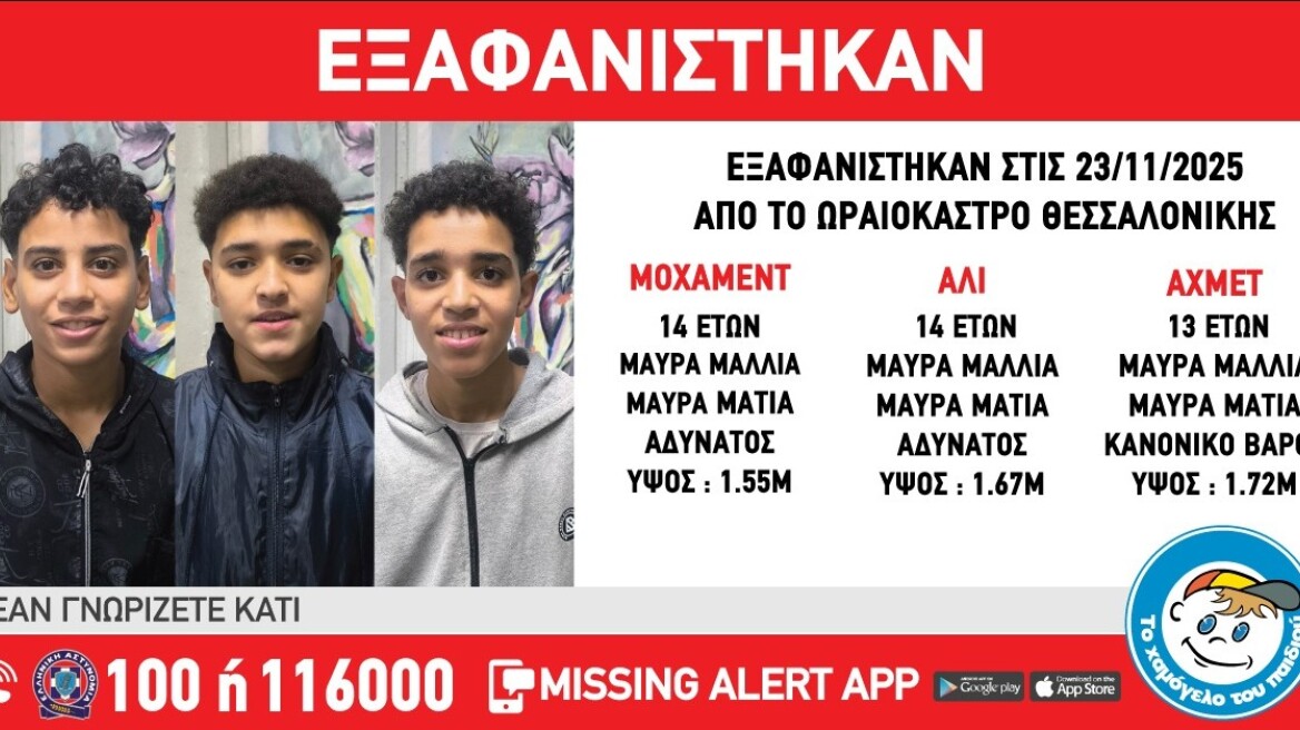 Συναγερμός σήμανε στις Αρχές για την εξαφάνιση τριών ανηλίκων από την περιοχή του Ωραιόκαστρου Θεσσαλονίκης. Σύμφωνα με το Χαμόγελο του Παιδιού, στις...